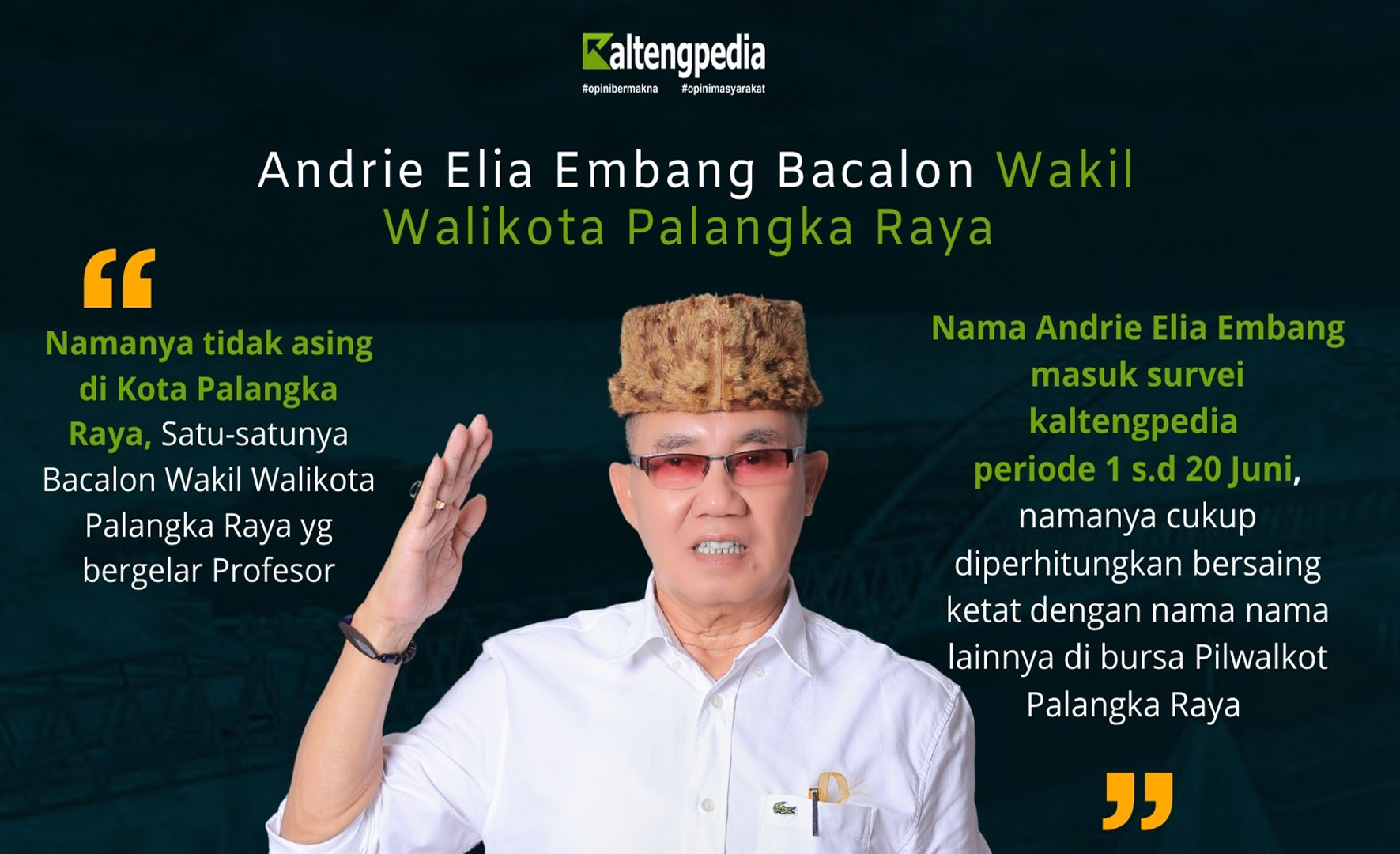 kaltengpedia.com – Nama Prof. Dr. Andrie Elia Embang, S.E., M.Si., kembali mencuat di kancah politik Palangka Raya. Sebagai satu-satunya bakal calon Wakil Walikota yang bergelar Profesor, Andrie Elia Embang, dengan visi besar memajukan pendidikan, menjadi salah satu kandidat yang diperhitungkan dalam Pemilihan Walikota dan Wakil Walikota Palangka Raya tahun 2024.Tidak asing di telinga masyarakat Palangka Raya, Andrie Elia Embang adalah seorang akademisi dan tokoh adat Kalimantan Tengah.