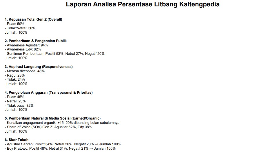 “Gen Z mengapresiasi proyek infrastruktur dan program UMKM, namun masih menuntut transparansi pengelolaan anggaran dan komunikasi yang lebih interaktif,” jelas tim Litbang Kaltengpedia dalam laporannya.