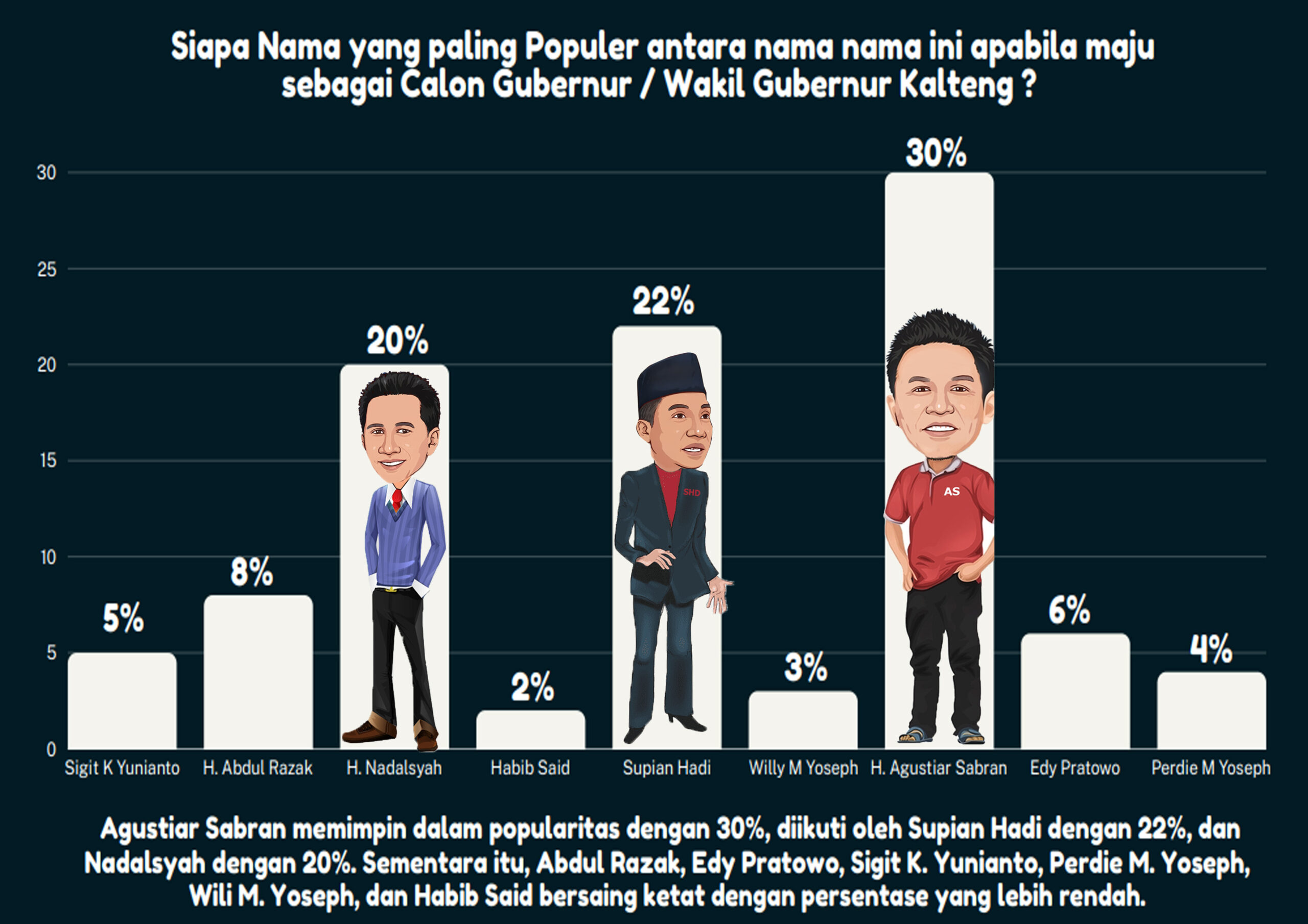 Agustiar Sabran memimpin dengan perolehan 30% dalam popularitas, menunjukkan dukungan yang kuat dari masyarakat Kalimantan Tengah. Kepemimpinannya yang solid serta program-program yang pro-rakyat kemungkinan besar menjadi faktor utama dalam tingginya popularitas tersebut.