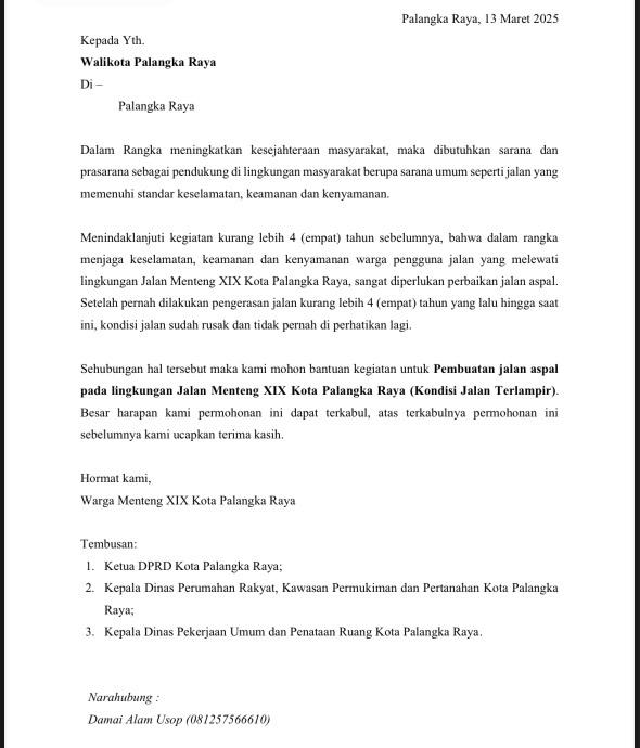“Menindaklanjuti kegiatan kurang lebih empat tahun sebelumnya, dalam rangka menjaga keselamatan, keamanan, dan kenyamanan warga pengguna jalan yang melewati lingkungan Jalan Menteng XIX Kota Palangka Raya, sangat diperlukan perbaikan jalan aspal,” tulis warga dalam surat tersebut.